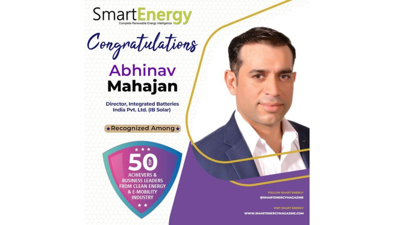 Noida, India – In a proud moment for IB Solar, Mr. Abhinav Mahajan, Director of IB Solar, has been featured in the Top 50 Achievers & Business Leaders shaping the future of Clean Energy and E-Mobility in 2025, an exclusive recognition by Smart Energy Magazine.